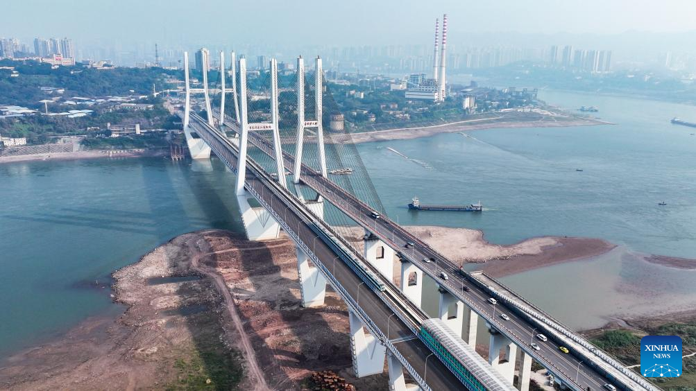 This aerial photo taken on Dec. 28, 2023 shows a train of Chongqing Rail Transit Line 18 passing on a bridge in southwest China's Chongqing Municipality. Chongqing Rail Transit (CRT) Line 18, which is 29 kilometers long and has 19 stations, officially started initial operation on Thursday. So far, a total of 13 rail transit lines are in operation in the city with an operating length reaching 538 kilometers. (Photo by Luo Bin/Xinhua)