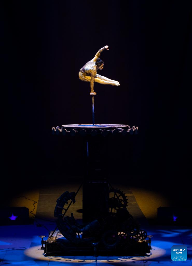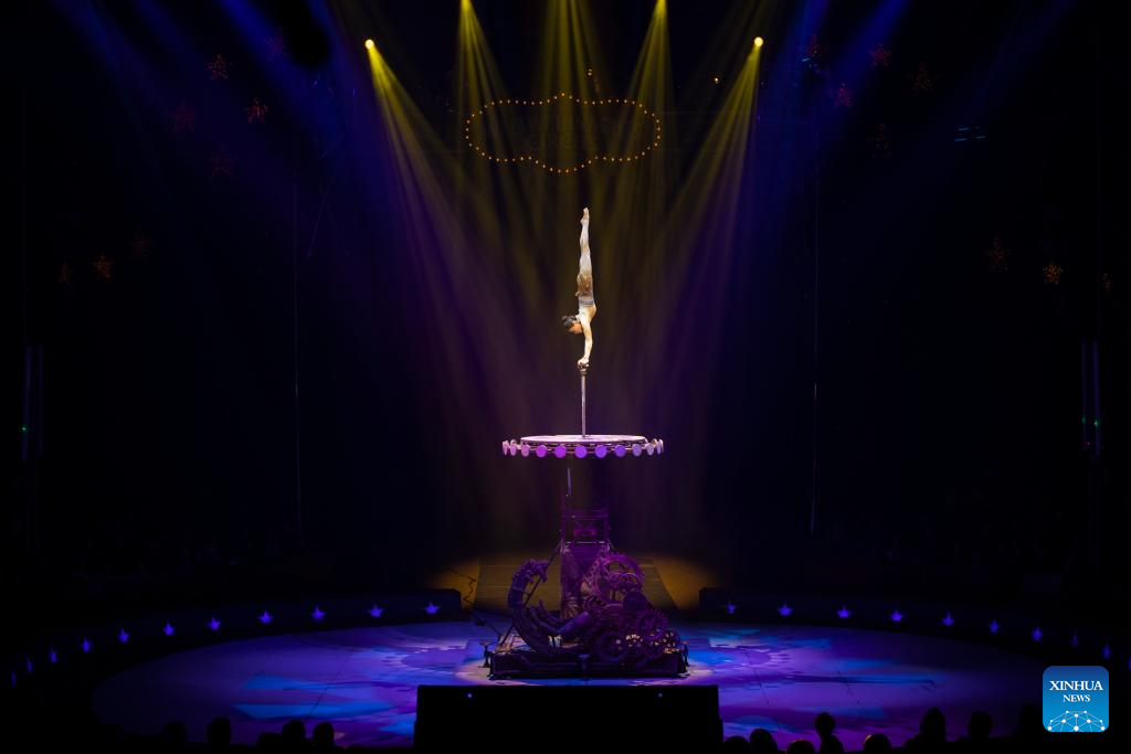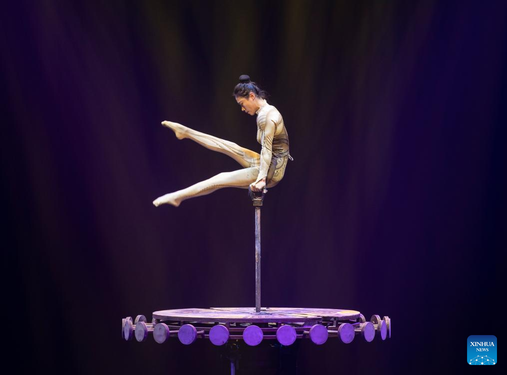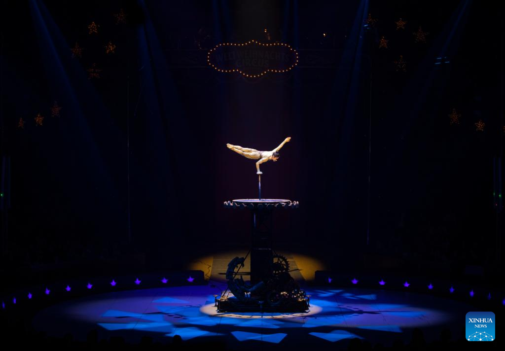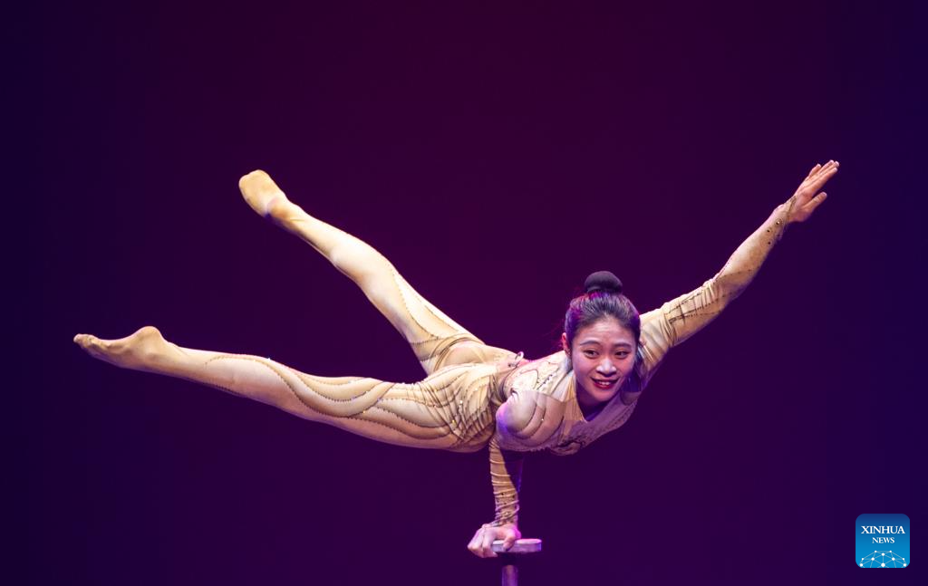 Acrobat Wang Mengchen of China's Jiangsu Acrobatic Troupe performs in Stuttgart, Germany, Dec. 28, 2023. An acrobatic performance by China's Jiangsu Acrobatic Troupe was shown to the public in Stuttgart of Germany on Thursday. (Xinhua/Zhang Fan)