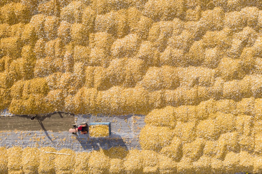 This aerial photo taken on Oct. 19, 2023 shows a farmer unloading corn to be dried in Dongsheng Village of Zhaodong City, northeast China's Heilongjiang Province. (Xinhua/Xie Jianfei)
