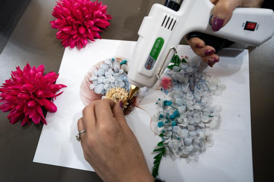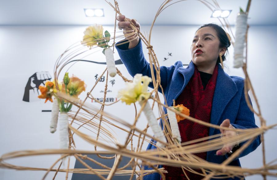 Yang Qiaoyan creates a floral work in Kunming, southwest China's Yunnan Province, Dec. 26, 2023. (Xinhua/Chen Xinbo)