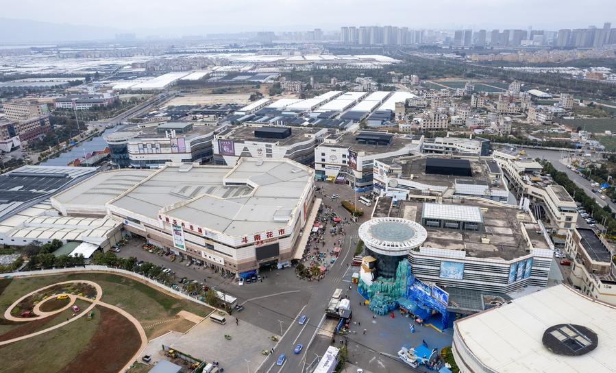 This aerial photo taken on Dec. 26, 2023 shows a view of the Dounan Flower Market in Kunming, southwest China's Yunnan Province. (Xinhua/Chen Xinbo)
