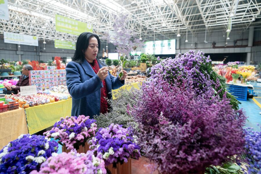 Yang Qiaoyan selects flowers at Dounan Flower Market in Kunming, southwest China's Yunnan Province, Dec. 26, 2023. (Xinhua/Chen Xinbo)