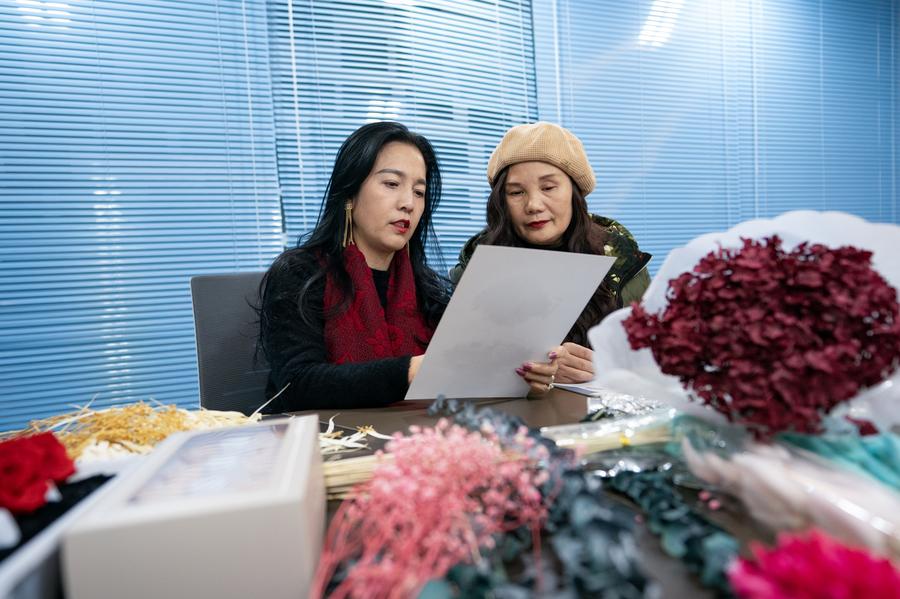 Yang Qiaoyan (L) discusses with her friends about floral works at her workshop in Kunming, southwest China's Yunnan Province, Dec. 26, 2023. (Xinhua/Chen Xinbo)