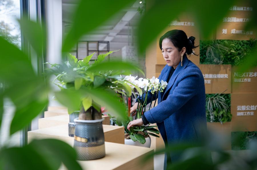 Yang Qiaoyan introduces her floral work on a livestream in Kunming, southwest China's Yunnan Province, Dec. 26, 2023. (Xinhua/Chen Xinbo)