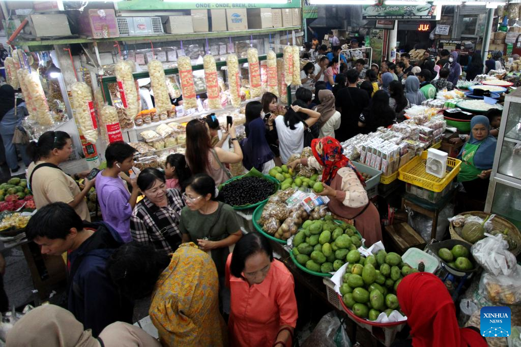 People shop during New Year holiday at Pasar Gede traditional market in Surakarta, Central Java, Indonesia, on Dec. 31, 2023. (Photo by Bram Selo/Xinhua)