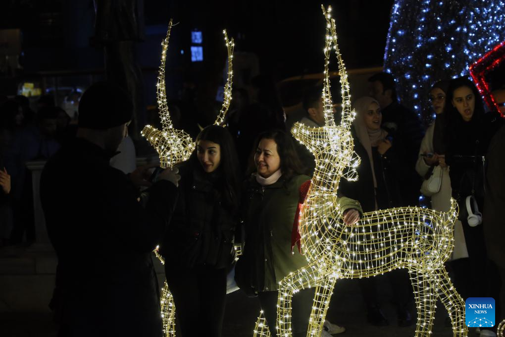 People pose for photos with New Year's lights installations in Ankara, Türkiye, Dec. 30, 2023. (Mustafa Kaya/Handout via Xinhua)