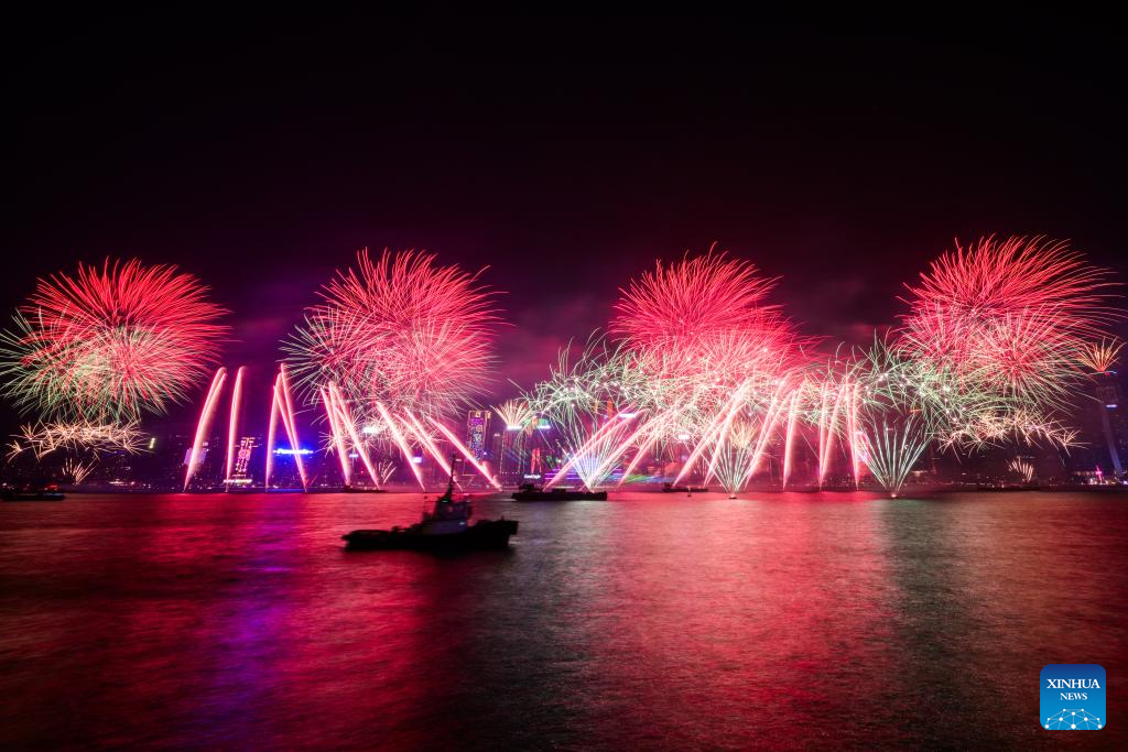 Fireworks in celebration of the New Year illuminate the sky over Victoria Harbour in Hong Kong, south China, Jan. 1, 2024. (Xinhua/Chen Duo)