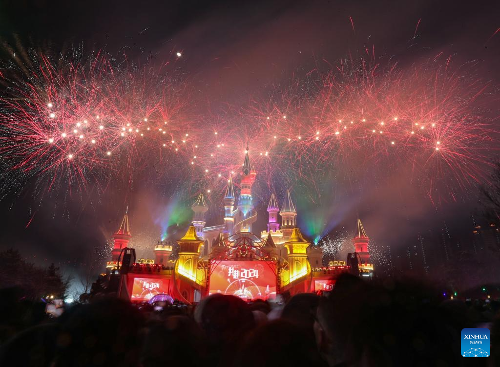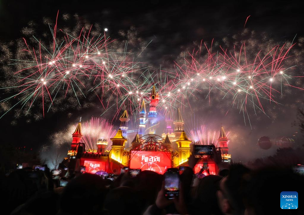 This photo taken on Jan. 1, 2024 shows fireworks above the Fantawild Adventure in Shenyang, northeast China's Liaoning Province. Various events are held across the country to celebrate the New Year. (Xinhua/Long Lei)