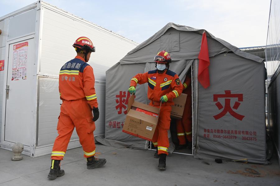 Firefighters transport medicine at a temporary relocation site in Kexinmin Village of Dahejia Township, Jishishan County, northwest China's Gansu Province, Jan. 1, 2024. (Xinhua/Fan Peishen)