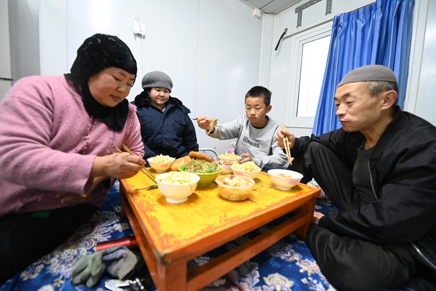 Villagers have a meal in a prefabricated house at a temporary relocation site in Dahe Village of Dahejia Township, Jishishan County, northwest China's Gansu Province, Jan. 1, 2024. (Xinhua/Fan Peishen)