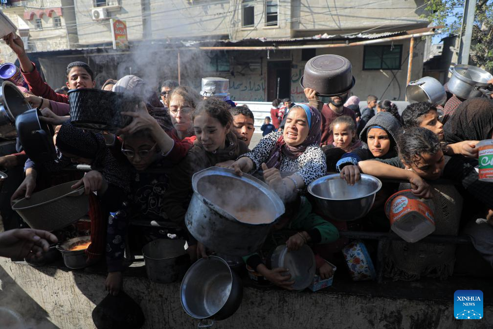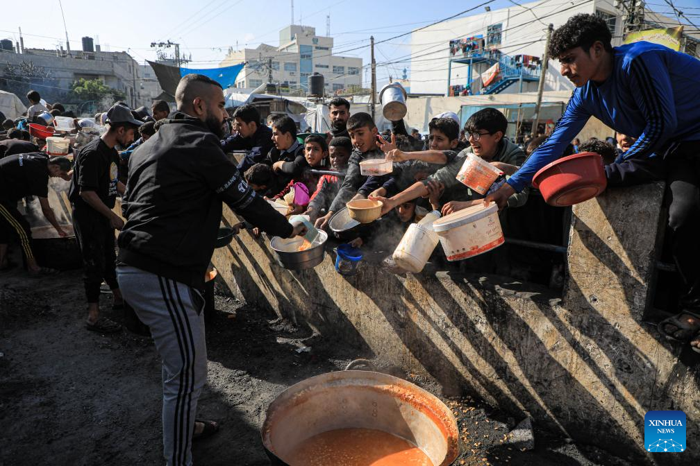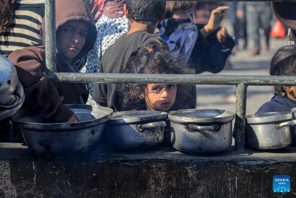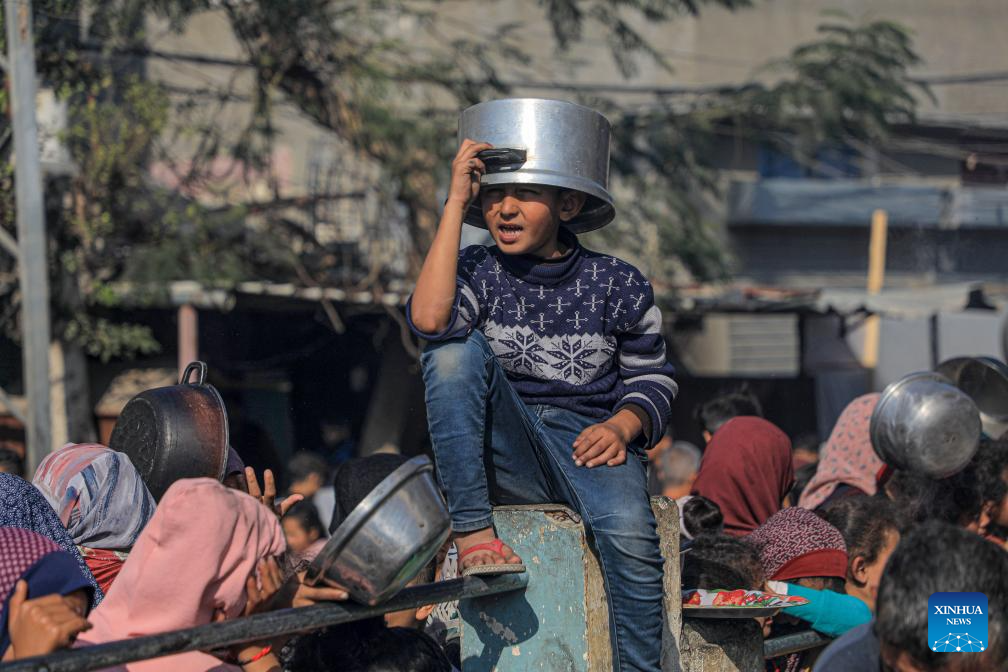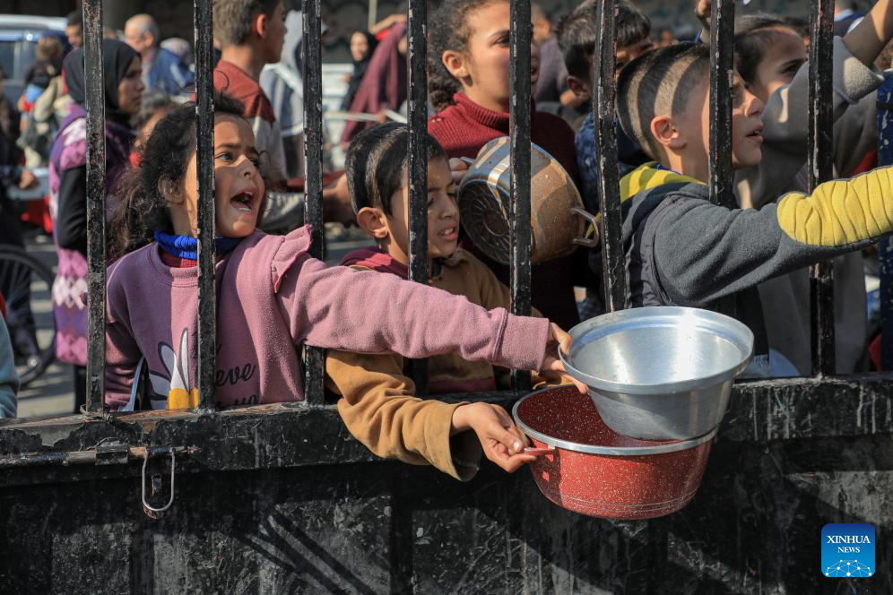 Children wait for food relief in the southern Gaza Strip city of Rafah, on Dec. 31, 2023. (Photo by Rizek Abdeljawad/Xinhua)