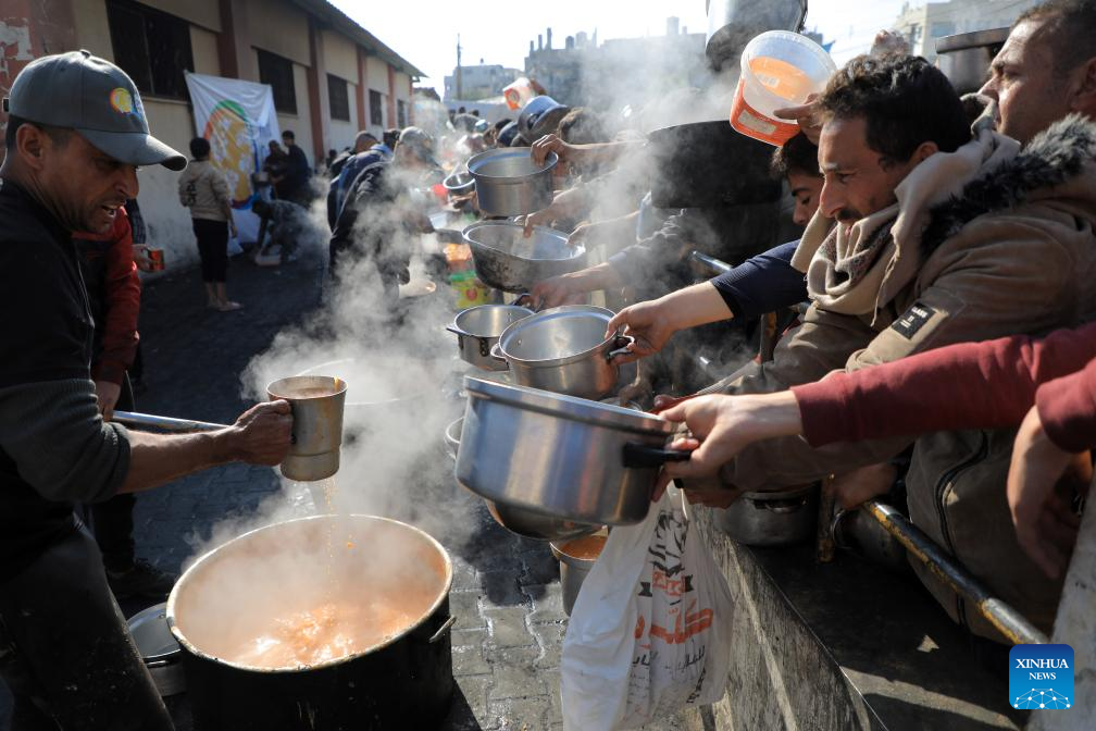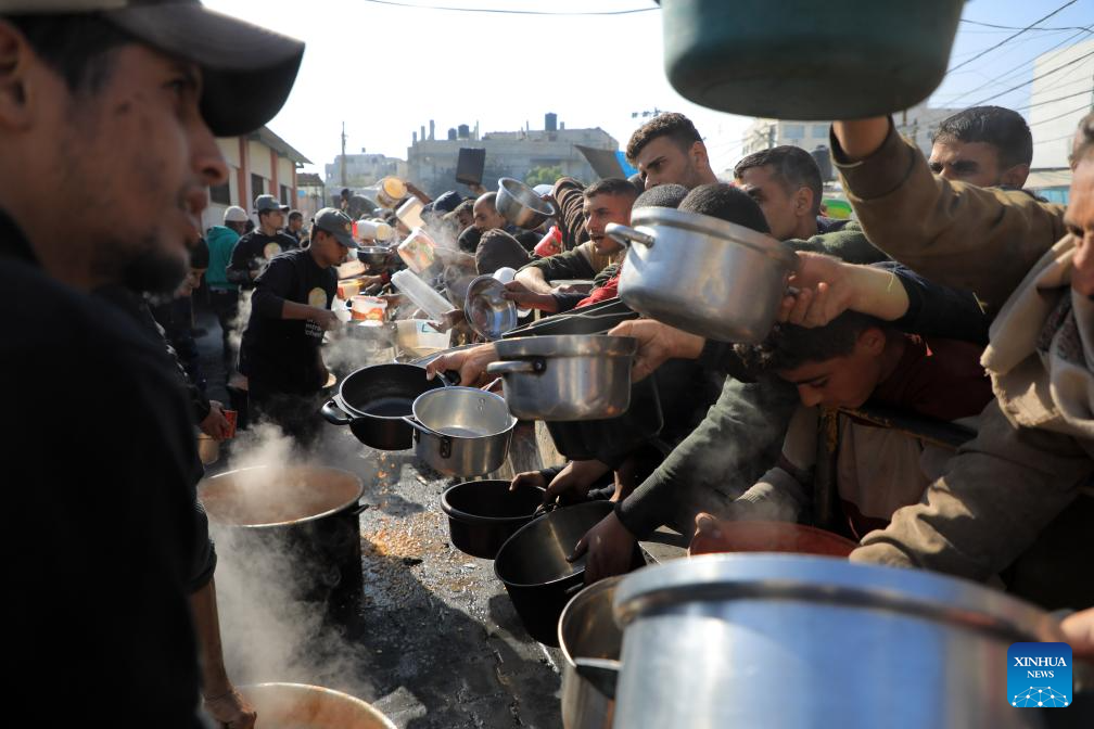 People wait for food relief in the southern Gaza Strip city of Rafah, on Dec. 31, 2023. (Photo by Rizek Abdeljawad/Xinhua)