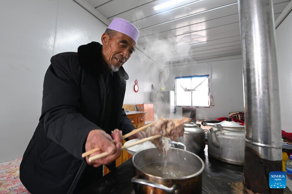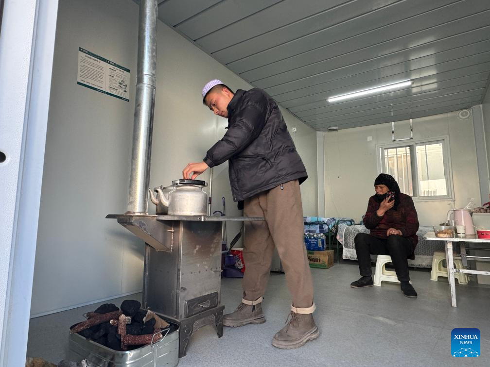 A villager cooks in a prefabricated house at a temporary relocation site in Kexinmin Village of Dahejia Township, Jishishan County, northwest China's Gansu Province, Jan. 1, 2024. All forces continued to stick to their posts at the temporary relocation sites for quake-affected people in northwest China's Gansu Province and the neighboring Qinghai Province on the first day of 2024. (Xinhua/Fan Peishen)