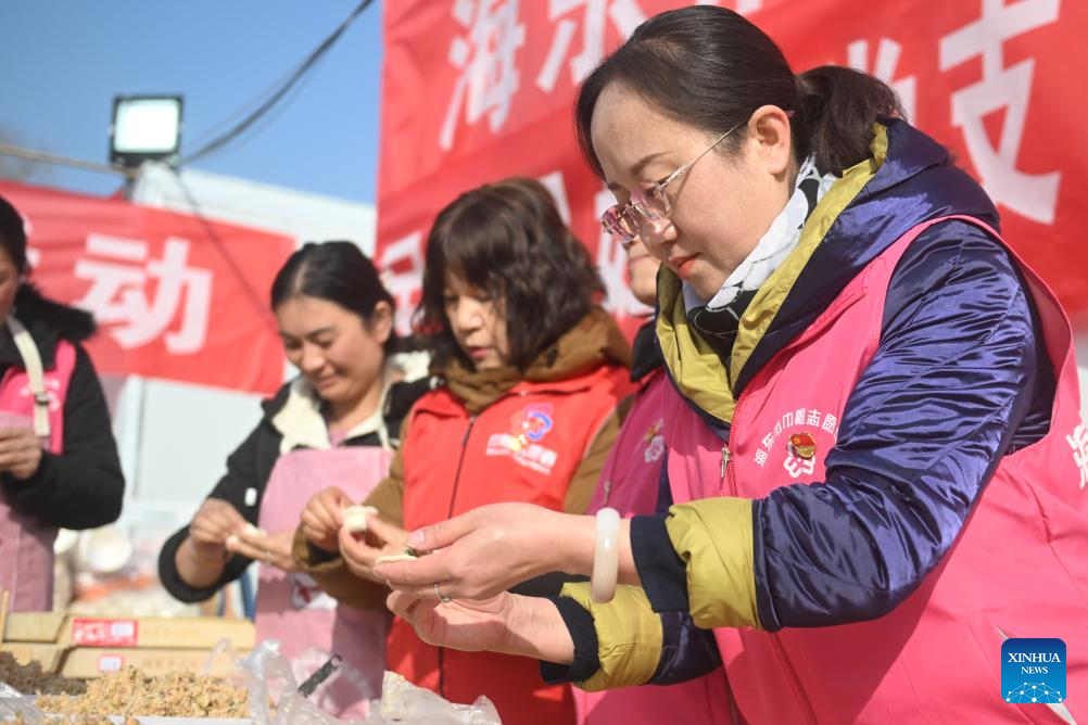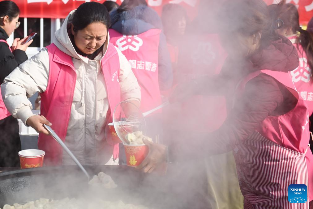 Volunteers prepare dumplings for villagers at a temporary relocation site in Caotan Village of Minhe Hui and Tu Autonomous County, Haidong City, northwest China's Qinghai Province, Jan. 1, 2024. All forces continued to stick to their posts at the temporary relocation sites for quake-affected people in northwest China's Gansu Province and the neighboring Qinghai Province on the first day of 2024. (Xinhua/Zhang Long)