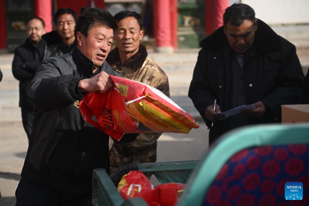 Villagers transport relief supplies at a temporary relocation site in Caotan Village of Minhe Hui and Tu Autonomous County, Haidong City, northwest China's Qinghai Province, Jan. 1, 2024. All forces continued to stick to their posts at the temporary relocation sites for quake-affected people in northwest China's Gansu Province and the neighboring Qinghai Province on the first day of 2024. (Xinhua/Zhang Long)