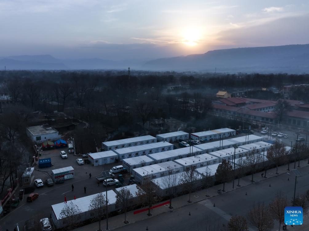 This aerial photo taken on Jan. 1, 2024 shows a temporary relocation site at sunrise in Shenjiaping Village of Shiyuan Township, Jishishan County, northwest China's Gansu Province. All forces continued to stick to their posts at the temporary relocation sites for quake-affected people in northwest China's Gansu Province and the neighboring Qinghai Province on the first day of 2024. (Xinhua/Fan Peishen)