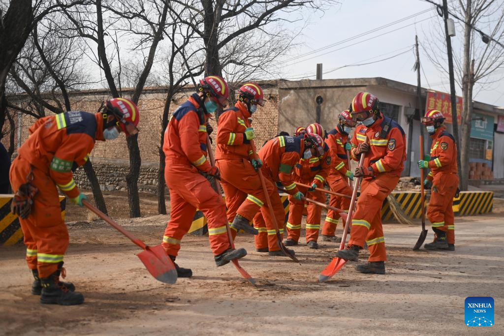 Firefighters clean a road at a temporary relocation site in Caotan Village of Minhe Hui and Tu Autonomous County, Haidong City, northwest China's Qinghai Province, Jan. 1, 2024. All forces continued to stick to their posts at the temporary relocation sites for quake-affected people in northwest China's Gansu Province and the neighboring Qinghai Province on the first day of 2024. (Xinhua/Zhang Long)