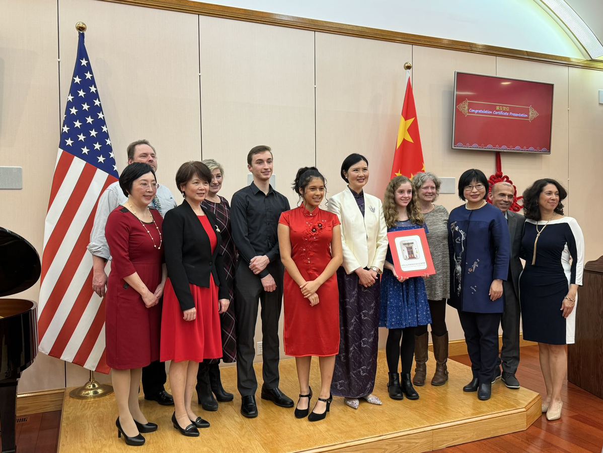 The three students were not just celebrating their victories at the competition; they were ambassadors of cultural understanding, building bridges of friendship between the US and China with every spoken word and graceful performance, said Zheng Xin, wife of Chinese Consul General Zhang Jianmin in San Francisco, who hosted the three students, their families and other Chinese-language learners from the Bay Area at their residence on Saturday night.