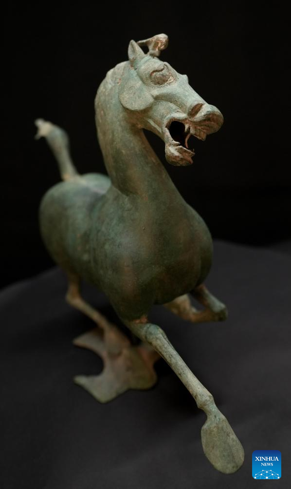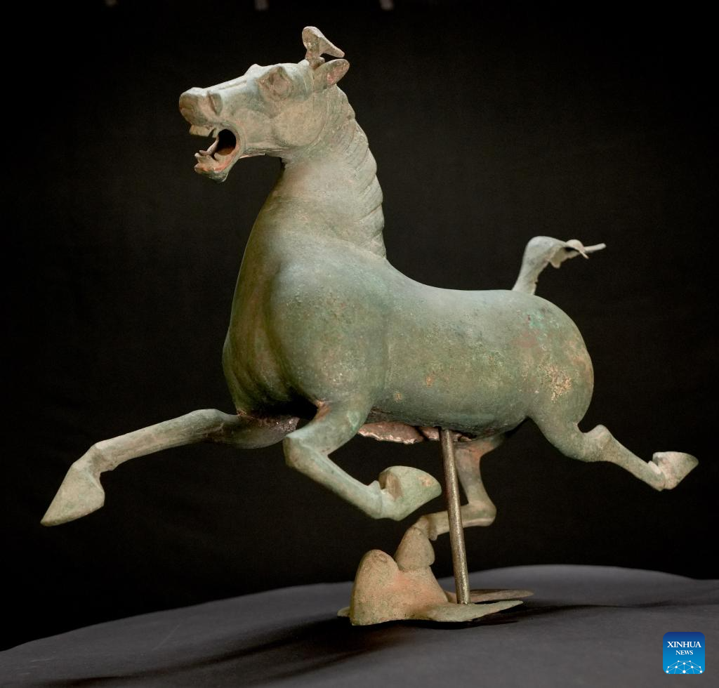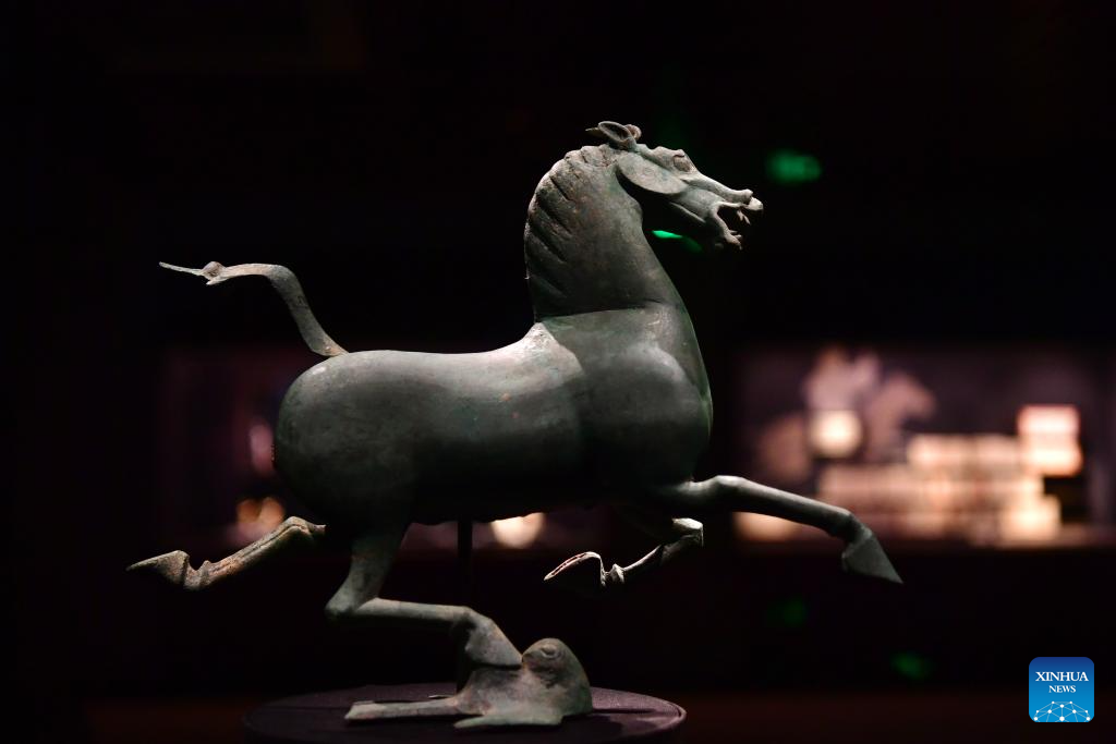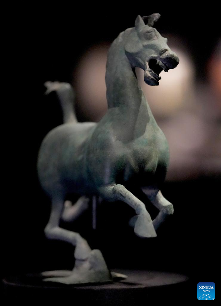 This photo taken on Oct. 27, 2023 shows the side view of an ancient bronze horse statue at Gansu Provincial Museum in Lanzhou, capital of northwest China's Gansu Province. The bronze horse statue, popularly known as "Bronze Galloping Horse Treading on a Flying Swallow," was unearthed in 1960s from the Leitai Tomb of the Eastern Han Dynasty (25-220 AD) in Wuwei of Gansu and is now preserved in the Gansu Provincial Museum. Its image became a symbol of Chinese tourism in 1983. (Xinhua/Wang Yuguo)