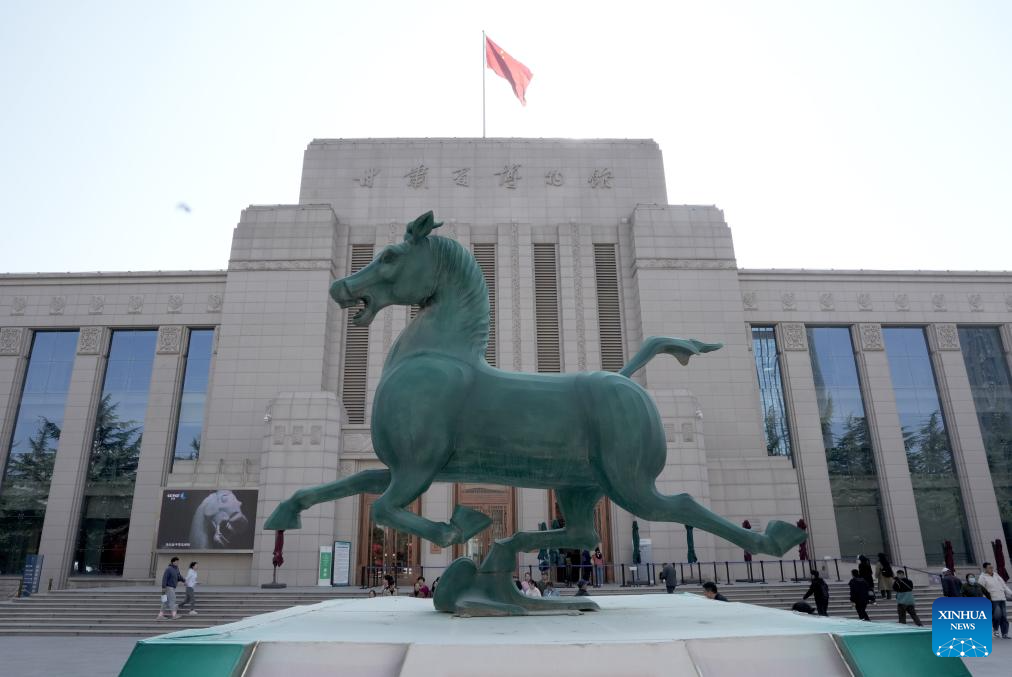 This photo taken on Oct. 27, 2023 shows an enlarged replica of an ancient bronze horse statue in front of Gansu Provincial Museum in Lanzhou, capital of northwest China's Gansu Province. The bronze horse statue, popularly known as "Bronze Galloping Horse Treading on a Flying Swallow," was unearthed in 1960s from the Leitai Tomb of the Eastern Han Dynasty (25-220 AD) in Wuwei of Gansu and is now preserved in the Gansu Provincial Museum. Its image became a symbol of Chinese tourism in 1983. (Xinhua/Wang Yuguo)
