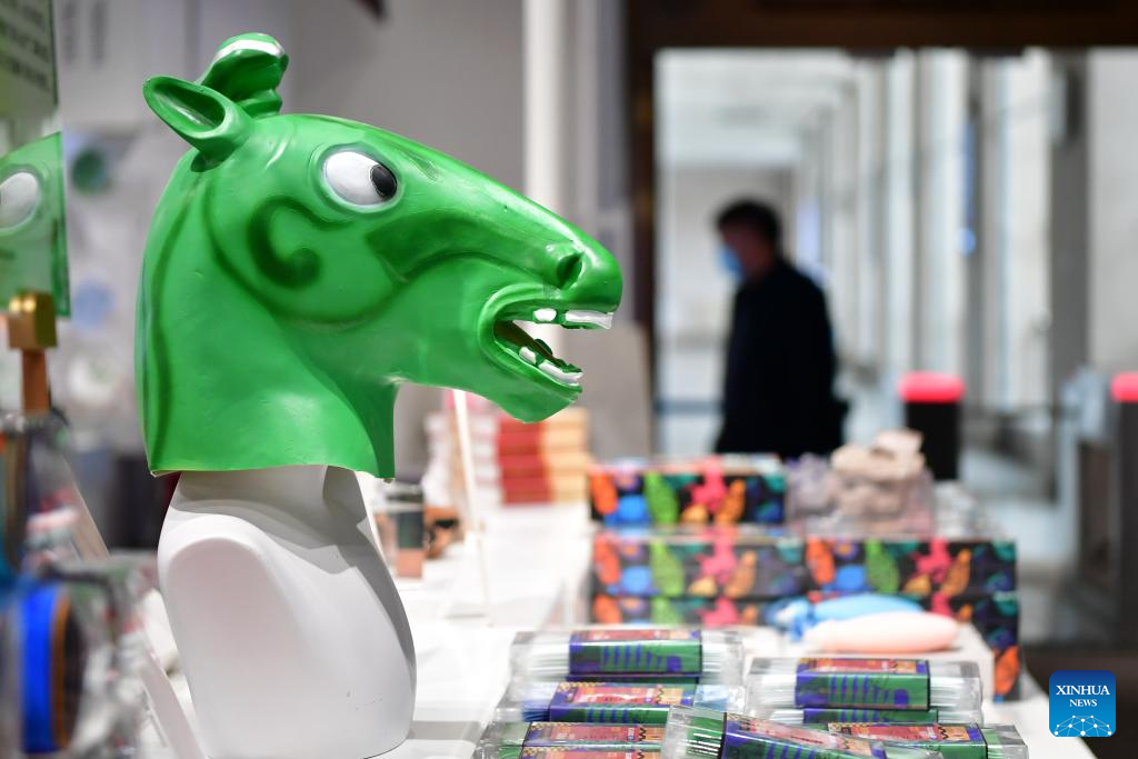 A souvenir resembling the head of an ancient bronze horse statue is seen at a store affiliated to Gansu Provincial Museum in Lanzhou, capital of northwest China's Gansu Province, May 13, 2022. The bronze horse statue, popularly known as "Bronze Galloping Horse Treading on a Flying Swallow," was unearthed in 1960s from the Leitai Tomb of the Eastern Han Dynasty (25-220 AD) in Wuwei of Gansu and is now preserved in the Gansu Provincial Museum. Its image became a symbol of Chinese tourism in 1983. (Xinhua/Chen Bin)