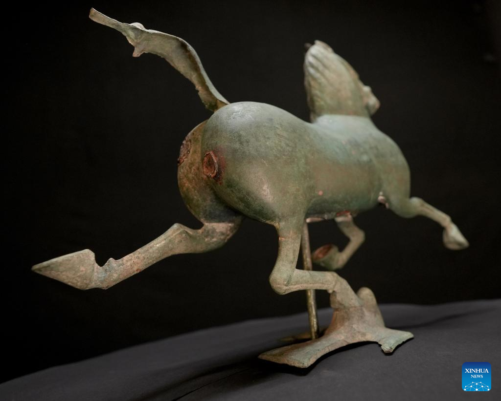 This photo taken on Oct. 27, 2023 shows the rear view of an ancient bronze horse statue at Gansu Provincial Museum in Lanzhou, capital of northwest China's Gansu Province. The bronze horse statue, popularly known as "Bronze Galloping Horse Treading on a Flying Swallow," was unearthed in 1960s from the Leitai Tomb of the Eastern Han Dynasty (25-220 AD) in Wuwei of Gansu and is now preserved in the Gansu Provincial Museum. Its image became a symbol of Chinese tourism in 1983. (Xinhua/Wang Yuguo)