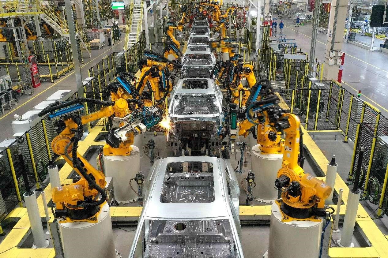 Robotic arms weld vehicle bodies in a workshop of a carmaker in Jimo district, Qingdao, east China's Shandong province, Dec. 28, 2023. (People's Daily Online/Liang Xiaopeng)