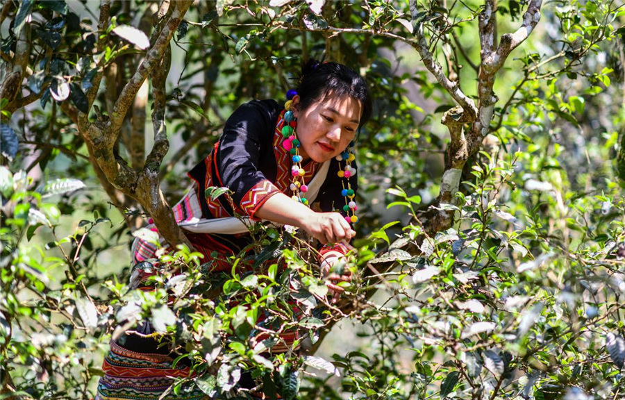 A farmer picks tea leaves on Jingmai Mountain on March 25 at the start of the spring tea harvest. [Photo/Xinhua]