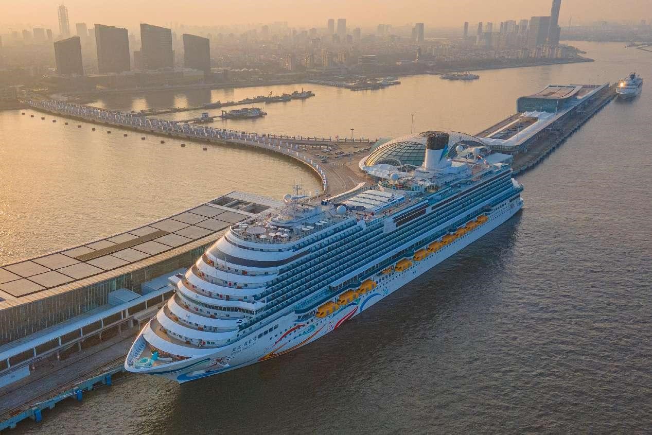 China's first domestically-built large cruise ship, the Adora Magic City, bathed in the morning sunlight on the first day of 2024, was docked at the Shanghai Wusongkou International Cruise Terminal, awaiting its commercial maiden voyage.