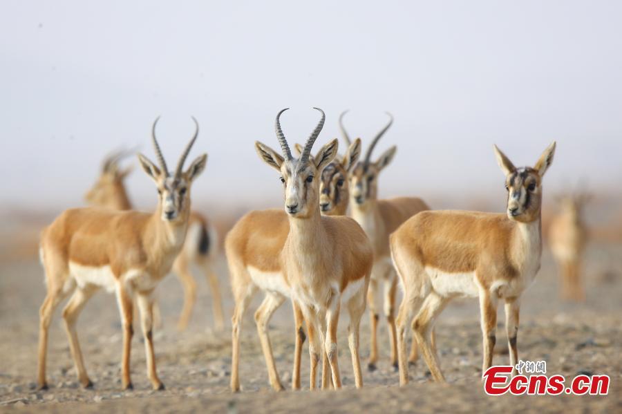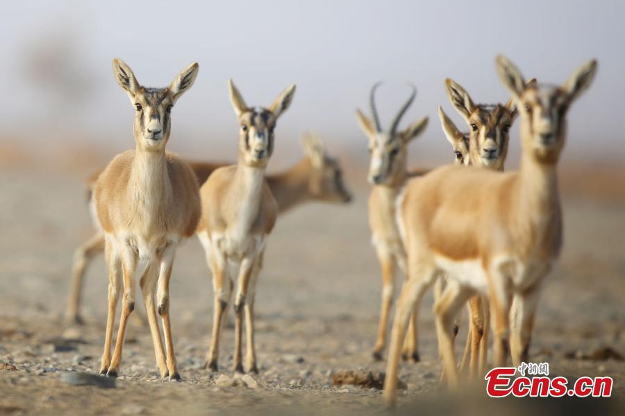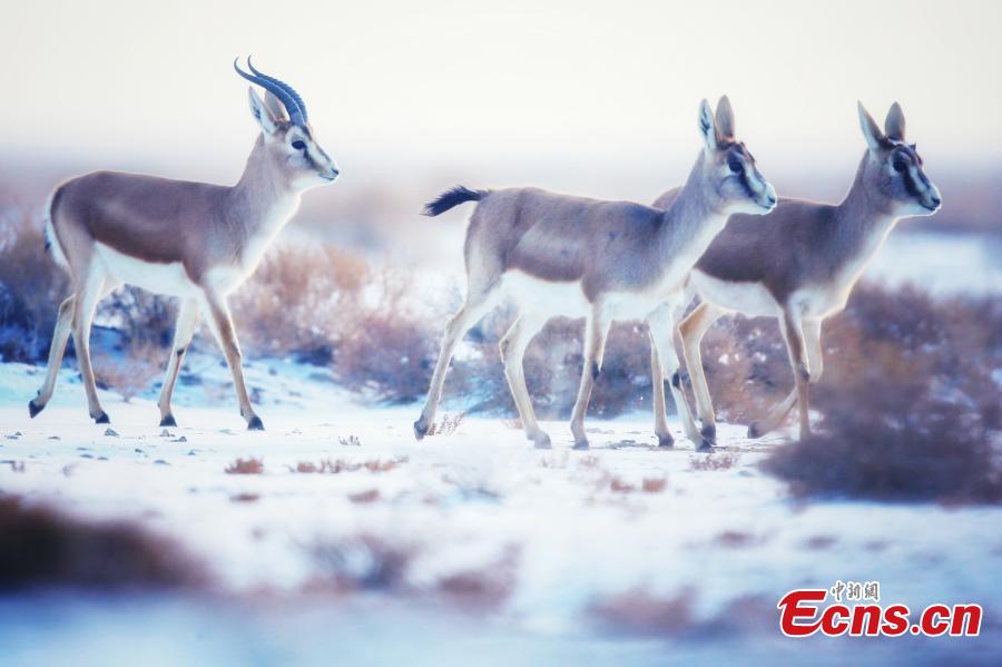 A herd of goitered gazelles are captured wandering on Nanshan Desert in Bohu county, Bayingolin Mongol Autonomous Prefecture, northwest China's Xinjiang Uygur Autonomous Region, Jan. 2, 2024. (Photo: China News Service/Nian Lei)