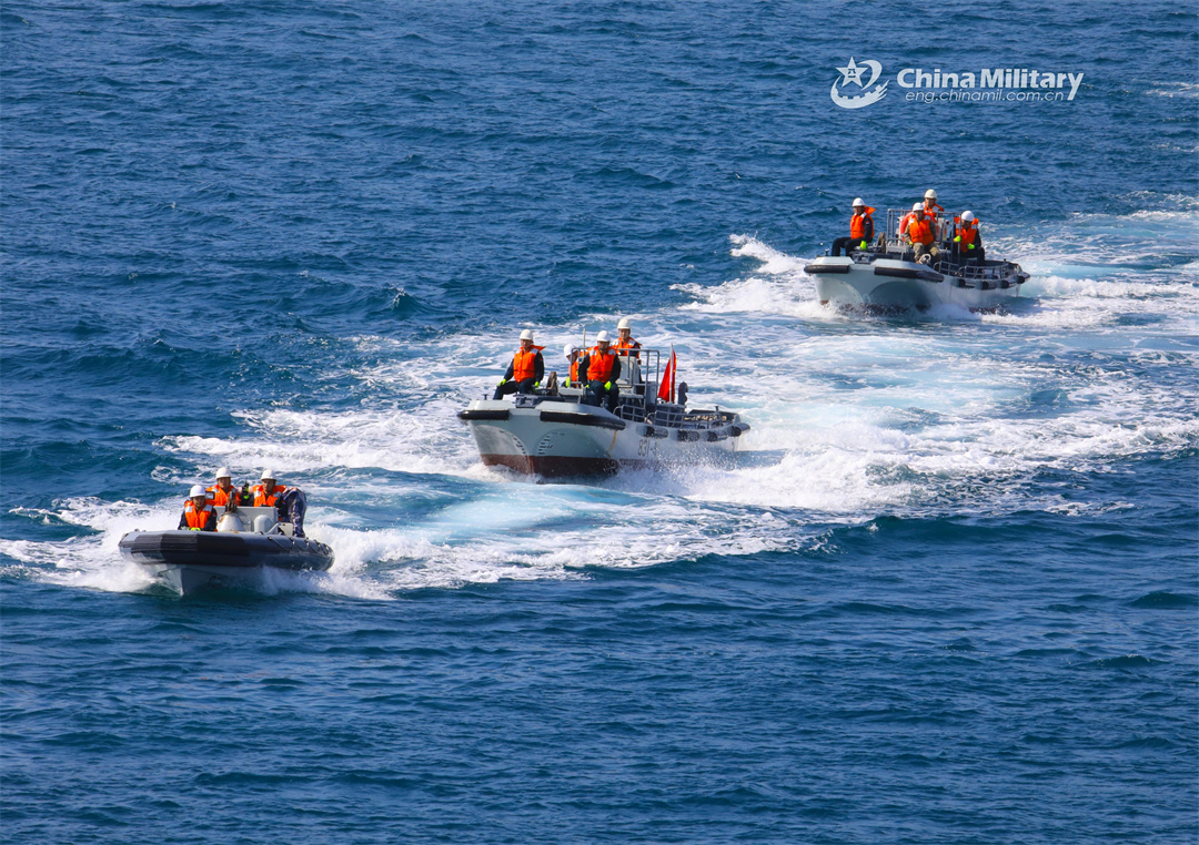 Speed boats attached to a naval service ship group of the PLA Navy approach a simulated war-damaged vessel to provide support during a four-day exercise in late December, 2023. (eng.chinamil.com.cn/Photo by Wu Huanqing)