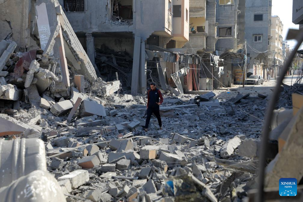 A man walks among the rubble of buildings destroyed in Israeli strikes in the southern Gaza Strip city of Khan Younis, on Jan. 4, 2024. Palestinian death toll from Israeli strikes on the Gaza Strip rose to 22,438 since the Israel-Hamas conflict broke out on Oct. 7, 2023, said the Gaza-based Health Ministry on Thursday. (Photo by Rizek Abdeljawad/Xinhua)
