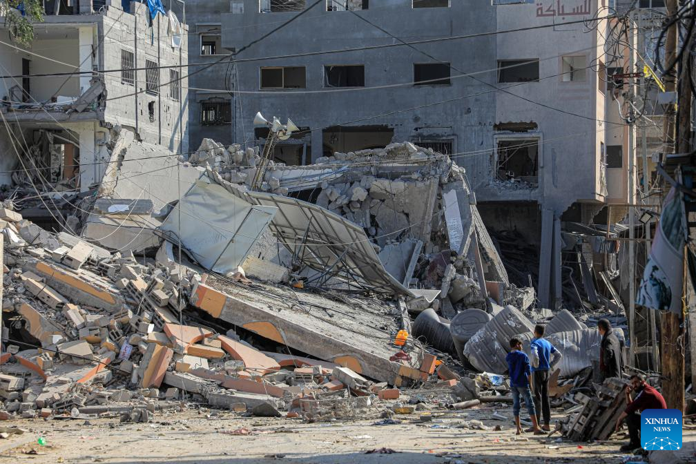 People are seen in front of buildings destroyed in Israeli strikes in the southern Gaza Strip city of Khan Younis, on Jan. 4, 2024. Palestinian death toll from Israeli strikes on the Gaza Strip rose to 22,438 since the Israel-Hamas conflict broke out on Oct. 7, 2023, said the Gaza-based Health Ministry on Thursday. (Photo by Rizek Abdeljawad/Xinhua)