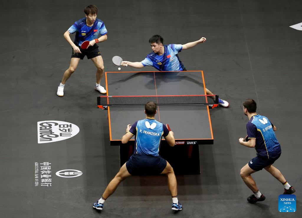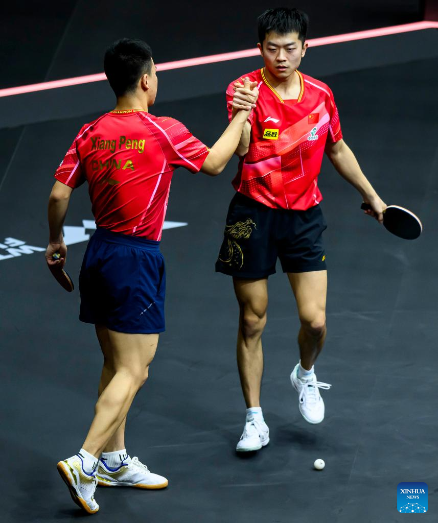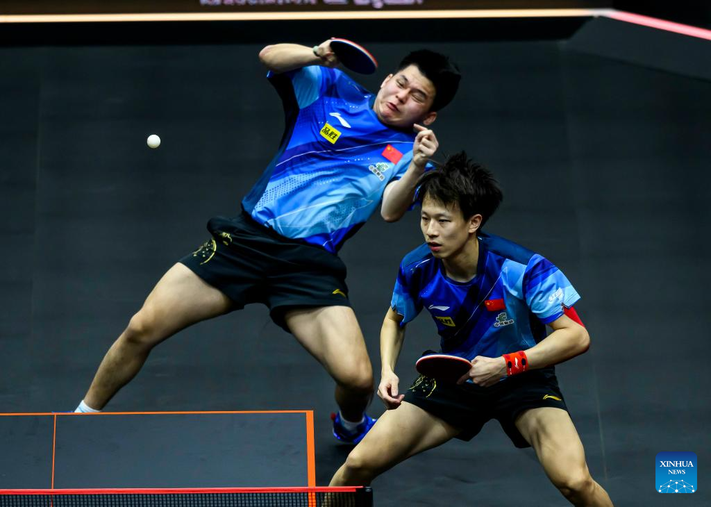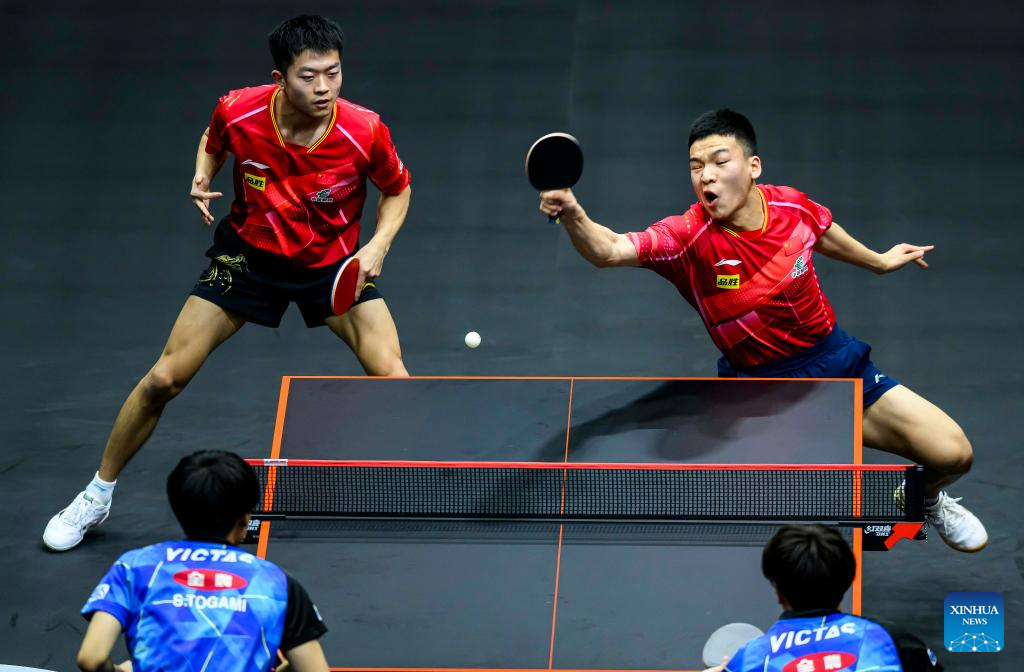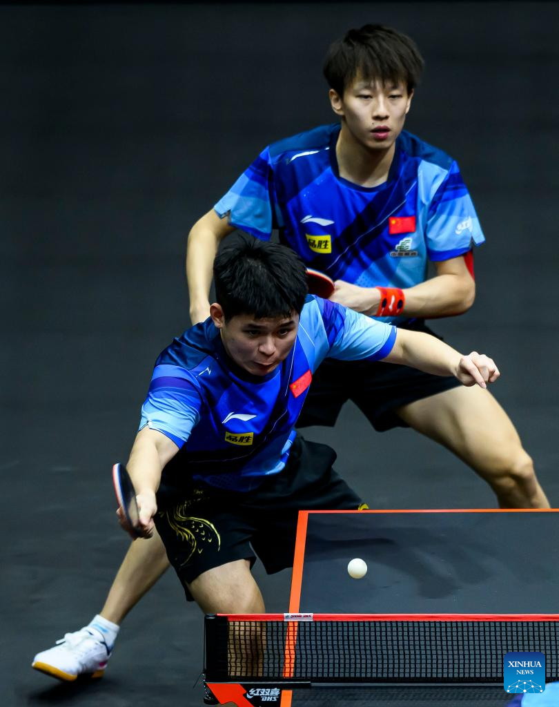 Lin Gaoyuan (R)/Lin Shidong of China compete during the men's doubles quarterfinal between Lin Gaoyuan/Lin Shidong of China and Dimitrij Ovtcharov/Patrick Franziska of Germany at WTT Finals Men Doha 2023 table tennis tournament in Doha, Qatar, Jan. 4, 2024. (Xinhua/Wang Dongzhen)
