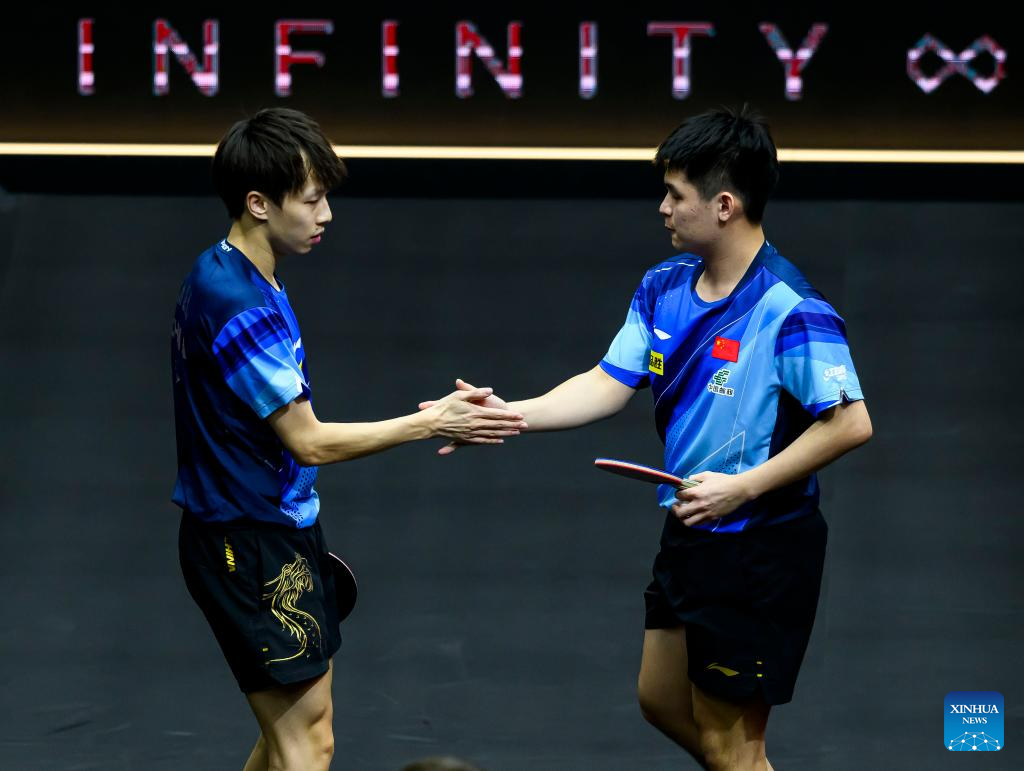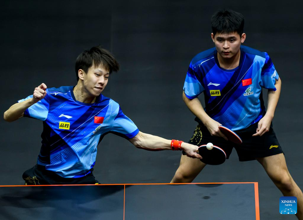 Lin Gaoyuan (L)/Lin Shidong of China compete during the men's doubles quarterfinal between Lin Gaoyuan/Lin Shidong of China and Dimitrij Ovtcharov/Patrick Franziska of Germany at WTT Finals Men Doha 2023 table tennis tournament in Doha, Qatar, Jan. 4, 2024. (Xinhua/Wang Dongzhen)