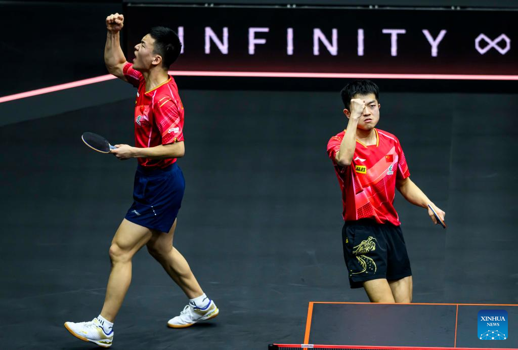 Lin Gaoyuan/Lin Shidong (R) of China celebrate after winning the men's doubles quarterfinal between Lin Gaoyuan/Lin Shidong of China and Dimitrij Ovtcharov/Patrick Franziska of Germany at WTT Finals Men Doha 2023 table tennis tournament in Doha, Qatar, Jan. 4, 2024. (Photo by Nikku/Xinhua)