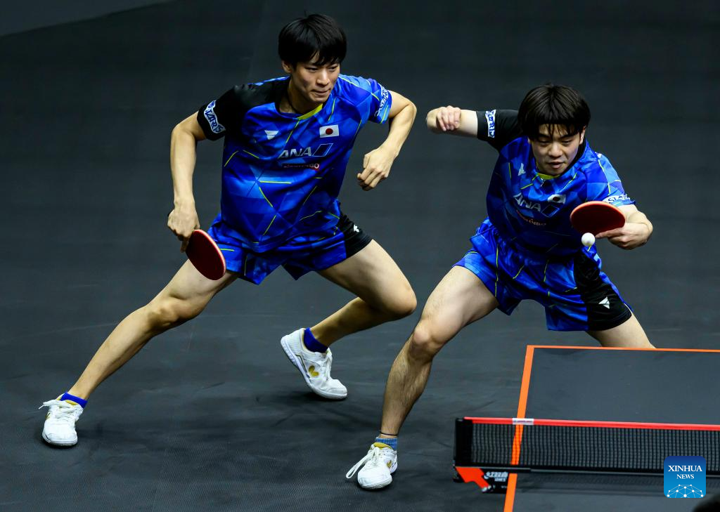 Togami Shunsuke/Uda Yukiya (R) of Japan compete during the men's doubles quarterfinal between Yuan Licen/Xiang Peng of China and Togami Shunsuke/Uda Yukiya of Japan at WTT Finals Men Doha 2023 table tennis tournament in Doha, Qatar, Jan. 4, 2024. (Photo by Nikku/Xinhua)