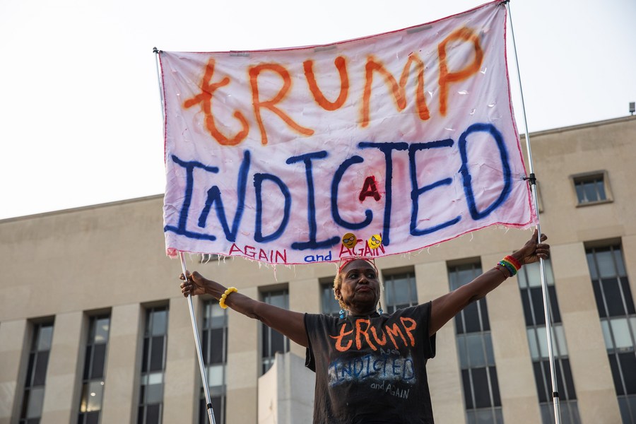 A woman holds a banner about former U.S. President Donald Trump's indictment in front of E. Barrett Prettyman United States Courthouse, where Trump will be arraigned, in Washington, D.C., the United States, Aug. 1, 2023. (Photo by Aaron Schwartz/Xinhua)