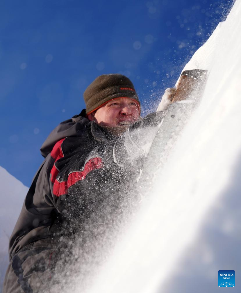 A contestant works on a snow sculpture at the Sun Island scenic area in Harbin, northeast China's Heilongjiang Province, Jan. 7, 2024. An international snow sculpture competition is held here, attracting snow sculptors from 12 countries. (Xinhua/Zhang Tao)
