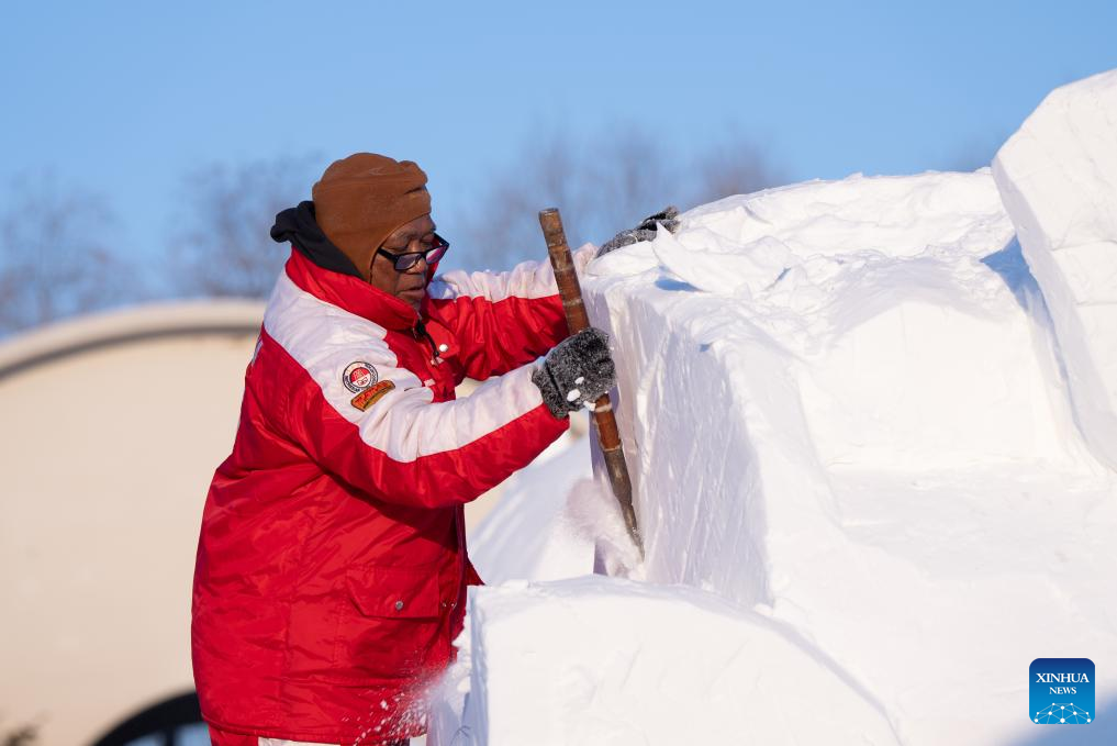 A contestant works on a snow sculpture at the Sun Island scenic area in Harbin, northeast China's Heilongjiang Province, Jan. 7, 2024. An international snow sculpture competition is held here, attracting snow sculptors from 12 countries. (Xinhua/Wang Dayu)