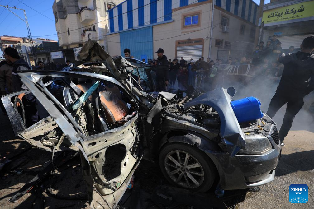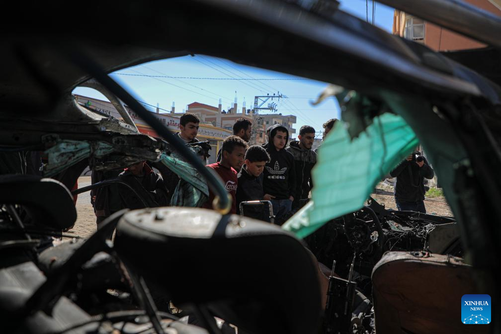People check the vehicle damaged by an Israeli airstrike in the southern Gaza Strip city of Rafah, on Jan. 7, 2024. (Photo by Rizek Abdeljawad/Xinhua)