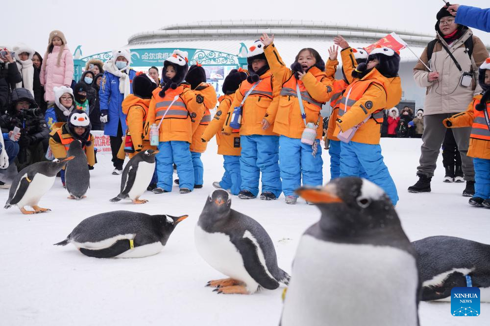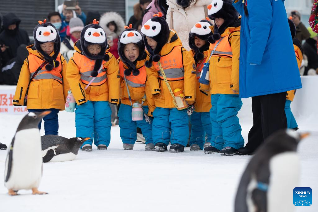 Children from south China's Guangxi Zhuang Autonomous Region meet with penguins as they visit the Harbin Polarpark in Harbin, northeast China's Heilongjiang Province, Jan. 6, 2024. These cute kids, nicknamed "little sugar tangerines" (a specialty produce of Guangxi) by netizens in China, have attracted millions of eyes during their trip to the northeast part of the country. (Xinhua/Zhang Tao)