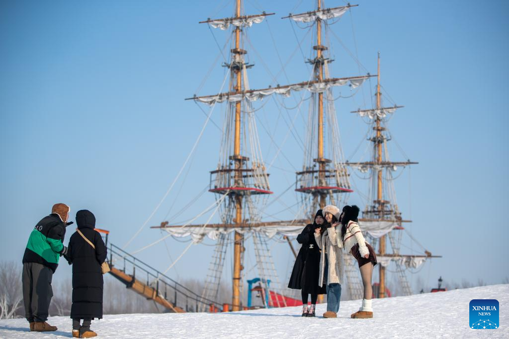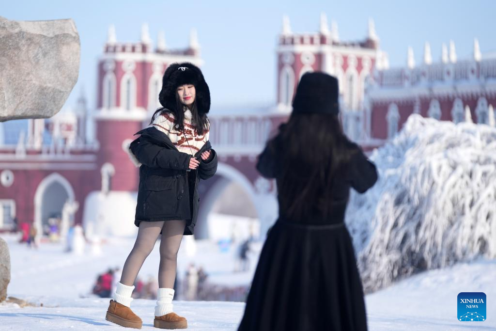People pose for photos at the Volga Manor in Harbin, northeast China's Heilongjiang Province, Jan. 7, 2024. The Volga Manor, a Russian culture-themed park, turned into a world of ice and snow during the winter time, attracting lots of visitors. (Xinhua/Zhang Tao)