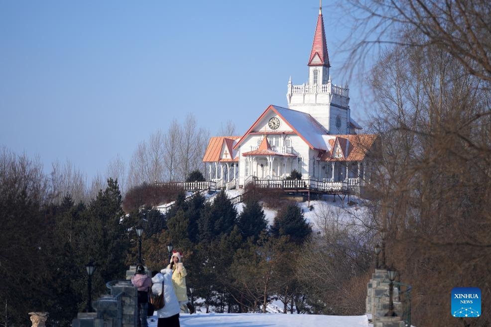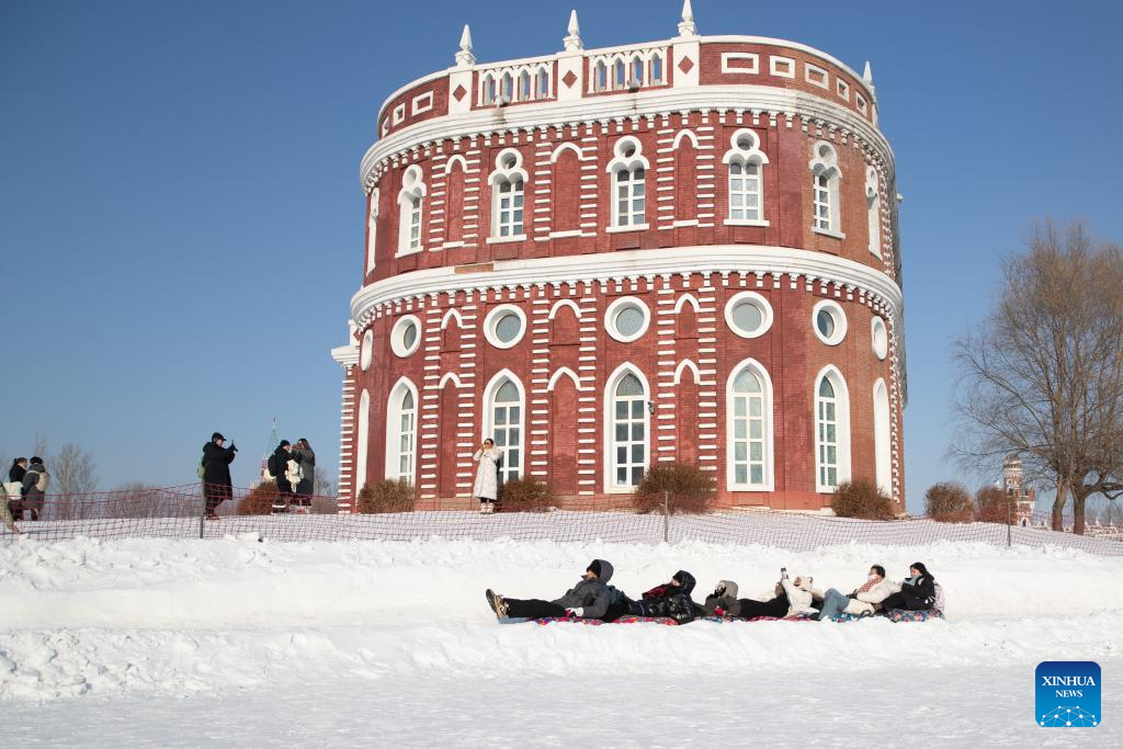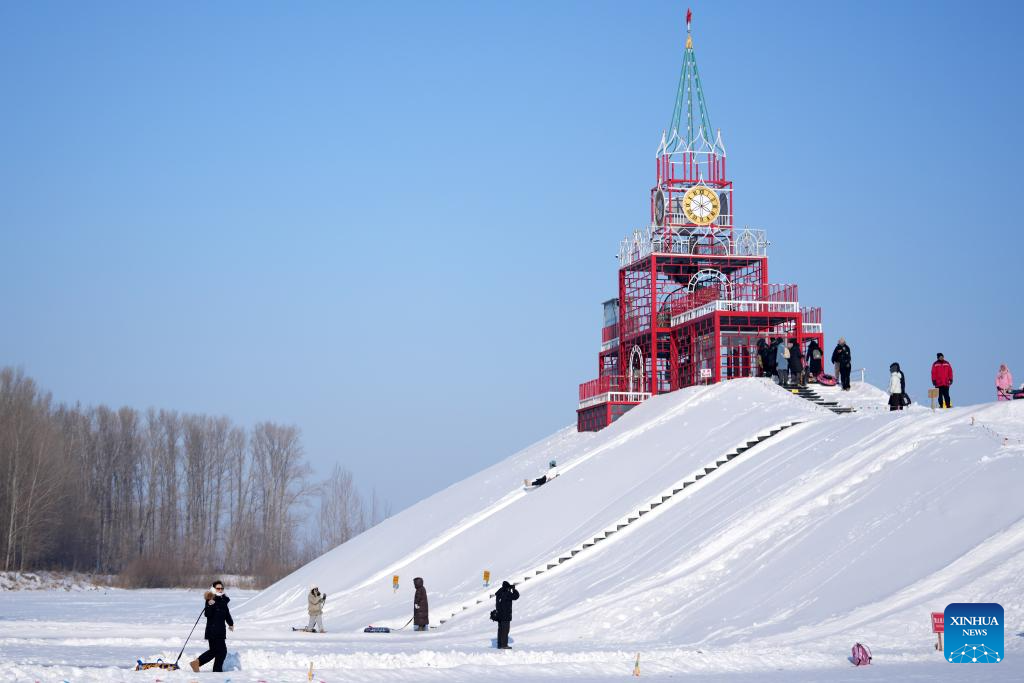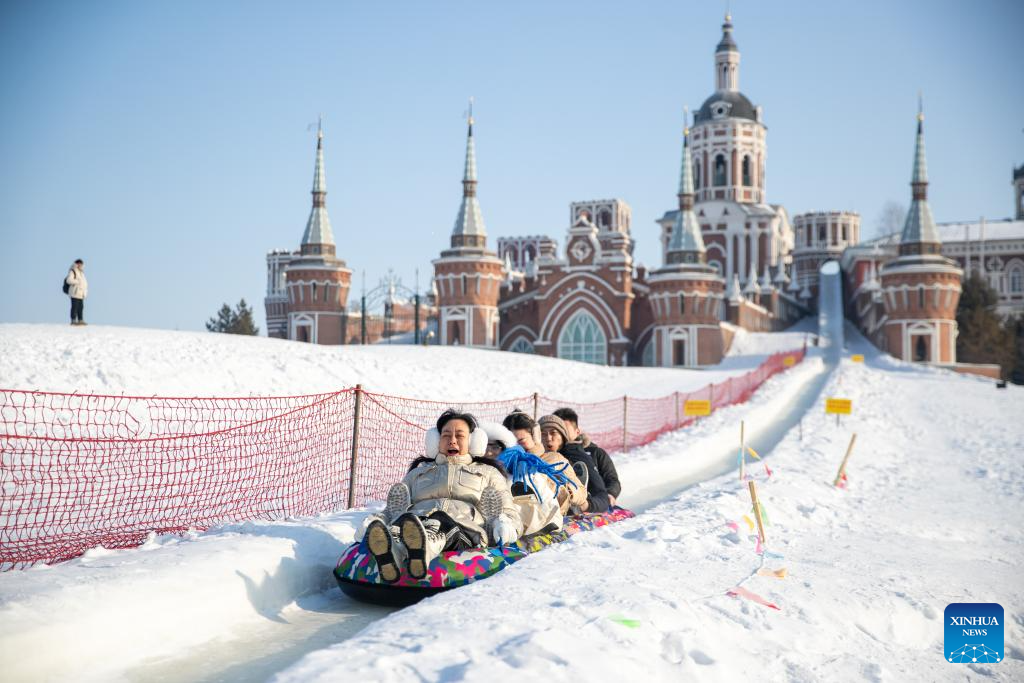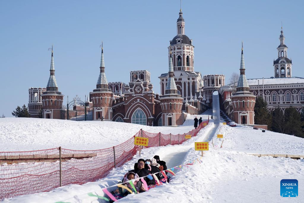 People enjoy themselves at the Volga Manor in Harbin, northeast China's Heilongjiang Province, Jan. 7, 2024. The Volga Manor, a Russian culture-themed park, turned into a world of ice and snow during the winter time, attracting lots of visitors. (Xinhua/Wang Jianwei)