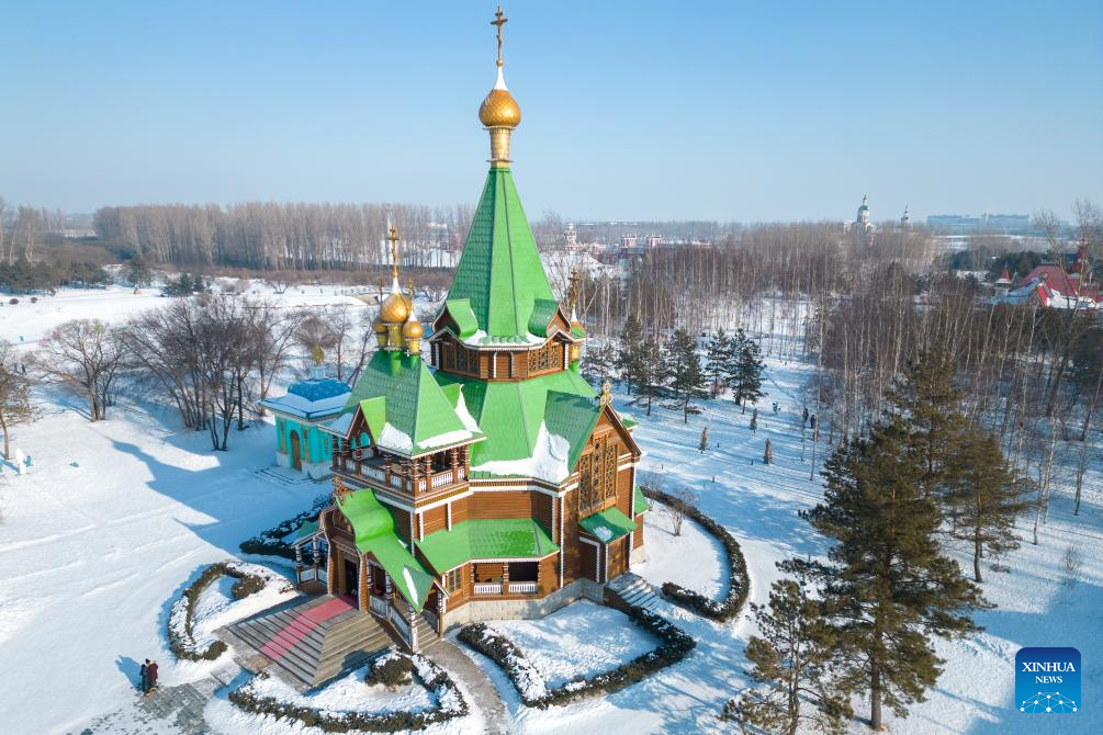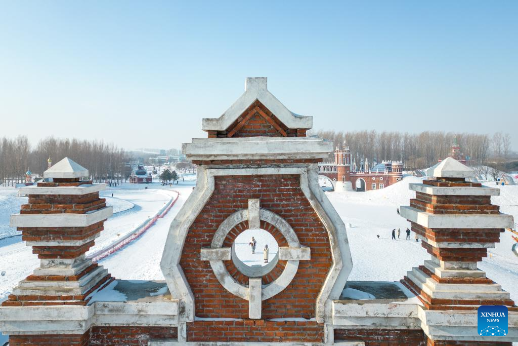 This aerial photo taken on Jan. 7, 2024 shows people visiting the Volga Manor in Harbin, northeast China's Heilongjiang Province. The Volga Manor, a Russian culture-themed park, turned into a world of ice and snow during the winter time, attracting lots of visitors. (Xinhua/Wang Jianwei)