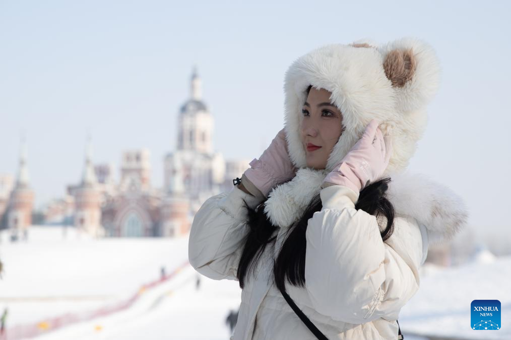 A tourist poses for photos at the Volga Manor in Harbin, northeast China's Heilongjiang Province, Jan. 7, 2024. The Volga Manor, a Russian culture-themed park, turned into a world of ice and snow during the winter time, attracting lots of visitors. (Xinhua/Zhang Tao)