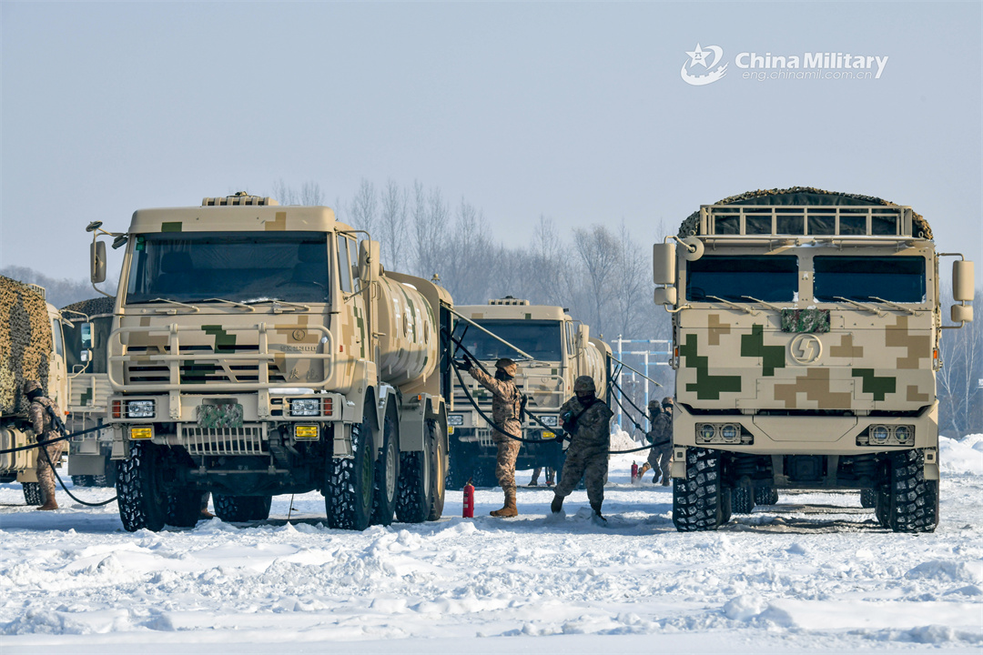 Soldiers assigned to a transport brigade of the Chinese People's Liberation Army Joint Logistic Support Force refuel transport vehicles on January 2 during their first training exercise in 2024. (eng.chinamil.com.cn/Photo by Xu Yongzheng)