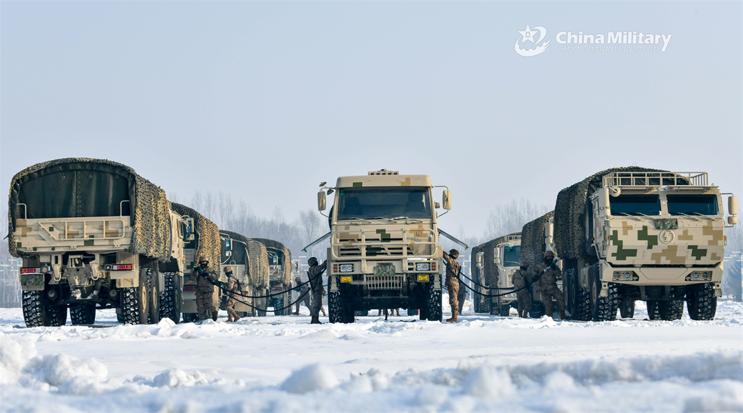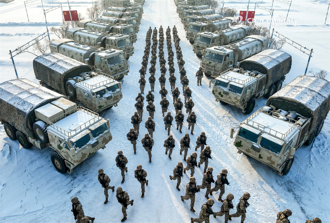 Soldiers assigned to a transport brigade of the Chinese People's Liberation Army Joint Logistic Support Force march toward the training field on January 2 for their first training exercise in 2024. (eng.chinamil.com.cn/Photo by Zhao Jiaqing)
