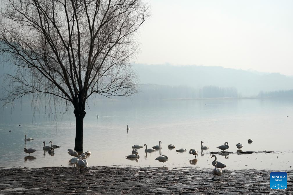White swans are seen at Pinglu Yellow River Wetland in Pinglu County of Yuncheng, north China's Shanxi Province, Jan. 9, 2024. The Pinglu Yellow River Wetland, covering over 6,000 hectares, has a pleasant climate and abundant food, and is one of China's winter habitats for white swans. (Xinhua/Zhan Yan)