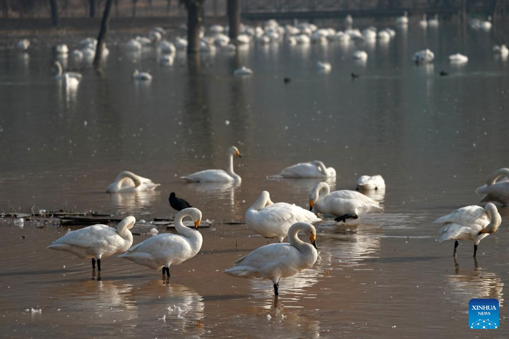 White swans forage at Pinglu Yellow River Wetland in Pinglu County of Yuncheng, north China's Shanxi Province, Jan. 9, 2024. The Pinglu Yellow River Wetland, covering over 6,000 hectares, has a pleasant climate and abundant food, and is one of China's winter habitats for white swans. (Xinhua/Zhan Yan)